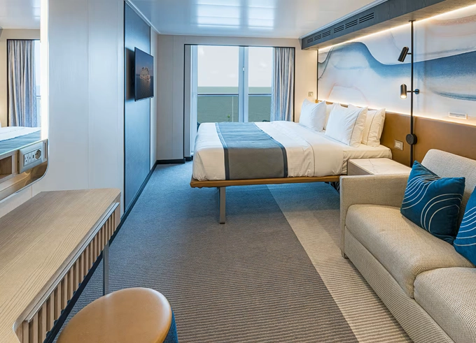 | SH - Suite s veľkým balkónom na korme 25 m² / balkón 34 m². 9. paluba - vzadu. Max 4 osoby. Výhody Suite. | 9 486 € 4 743 € za osobu | ||